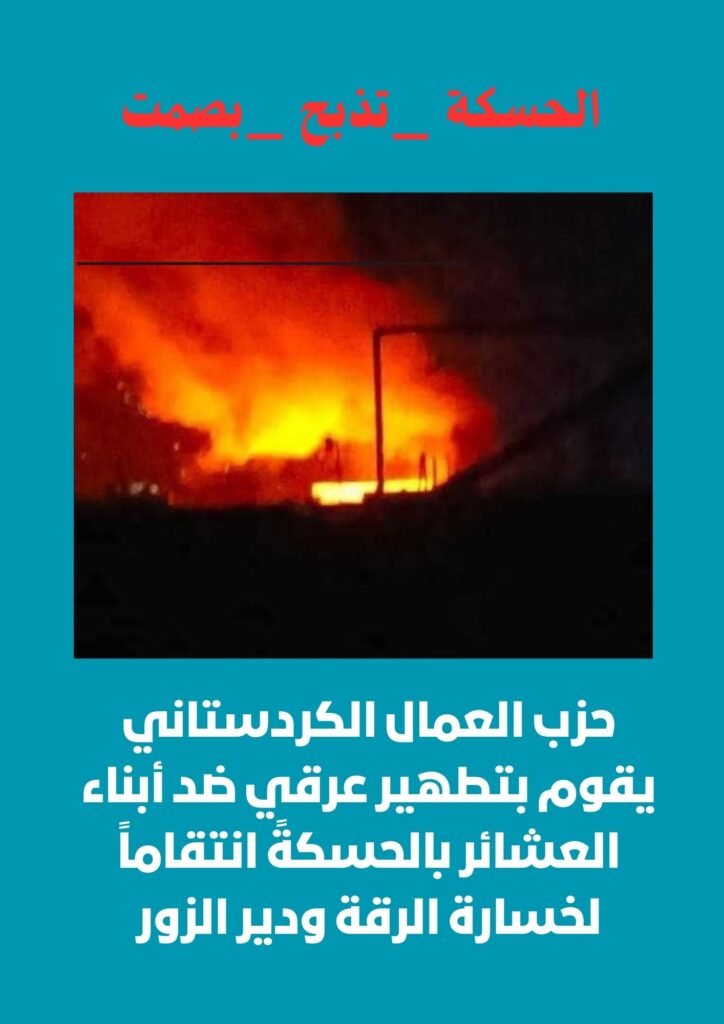 أصدر أهالي محافظة الحسكة نداءات إدانة شديد اللهجة، حمّلوا فيه مليشيا قسد وعناصر حزب العمال الكردستاني المسؤولية الكاملة عن جرائم انتقامية ومجازر مروّعة بحق المدنيين العرب، شملت القتل والحرق المتعمّد للمنازل وتهجير السكان قسرًا.