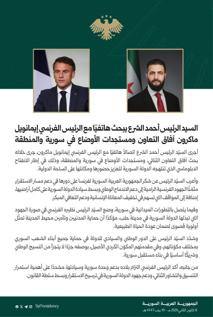 وفي سياق متصل، وضع الرئيس الشرع نظيره الفرنسي في صورة الجهود التي تبذلها الدولة السورية على الأرض، مؤكداً أن حماية المدنيين وتأمين محيط مدينة حلب تمثل أولوية قصوى، باعتبار ذلك ركيزة أساسية لضمان عودة الحياة الطبيعية وتعزيز الاستقرار.