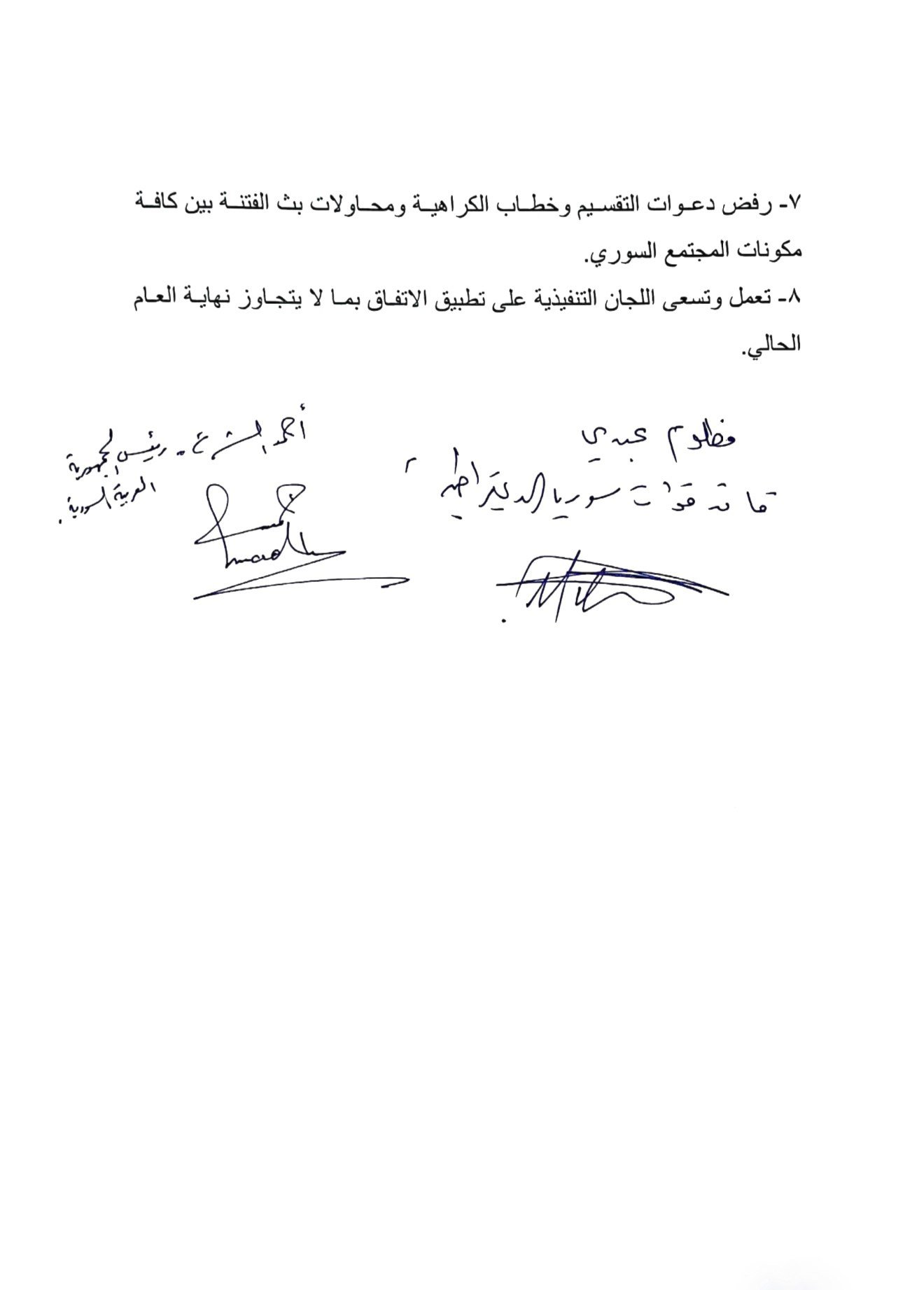 وفي هذا السياق، شدد الموقعون على أهمية مكافحة الإرهاب بكافة أشكاله ودعم الدولة السورية في جهودها ضد التنظيمات المسلحة التي تهدد أمنها واستقرارها. كما تضمن الاتفاق رفض خطاب الكراهية ومحاولات بث الفتنة بين المكونات السورية، والعمل على تعزيز التعايش المشترك.