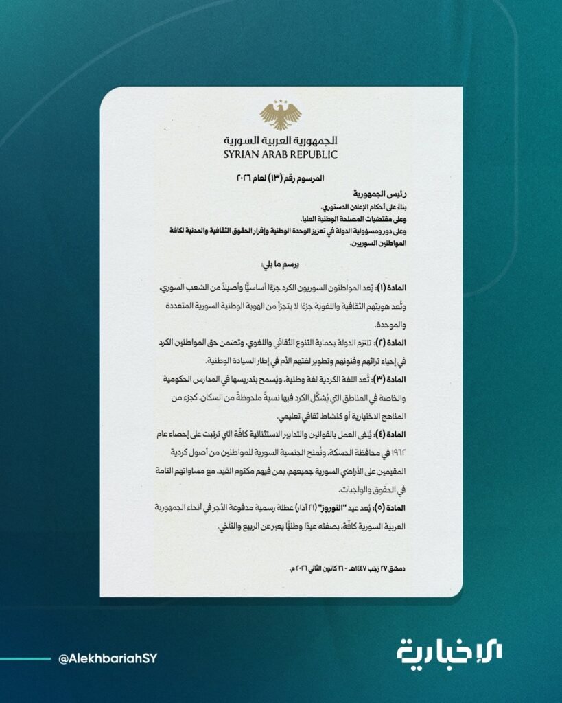 دمشق – أصدر السيد الرئيس أحمد الشرع المرسوم رقم (13) لعام 2026، الذي يؤكد بشكل قاطع أن المواطنين السوريين الكرد يشكّلون جزءًا أساسيًا وأصيلاً من نسيج الشعب السوري، وأن هويتهم الثقافية واللغوية تُعدّ مكوّنًا لا يتجزأ من الهوية الوطنية السورية المتعددة والموحّدة.