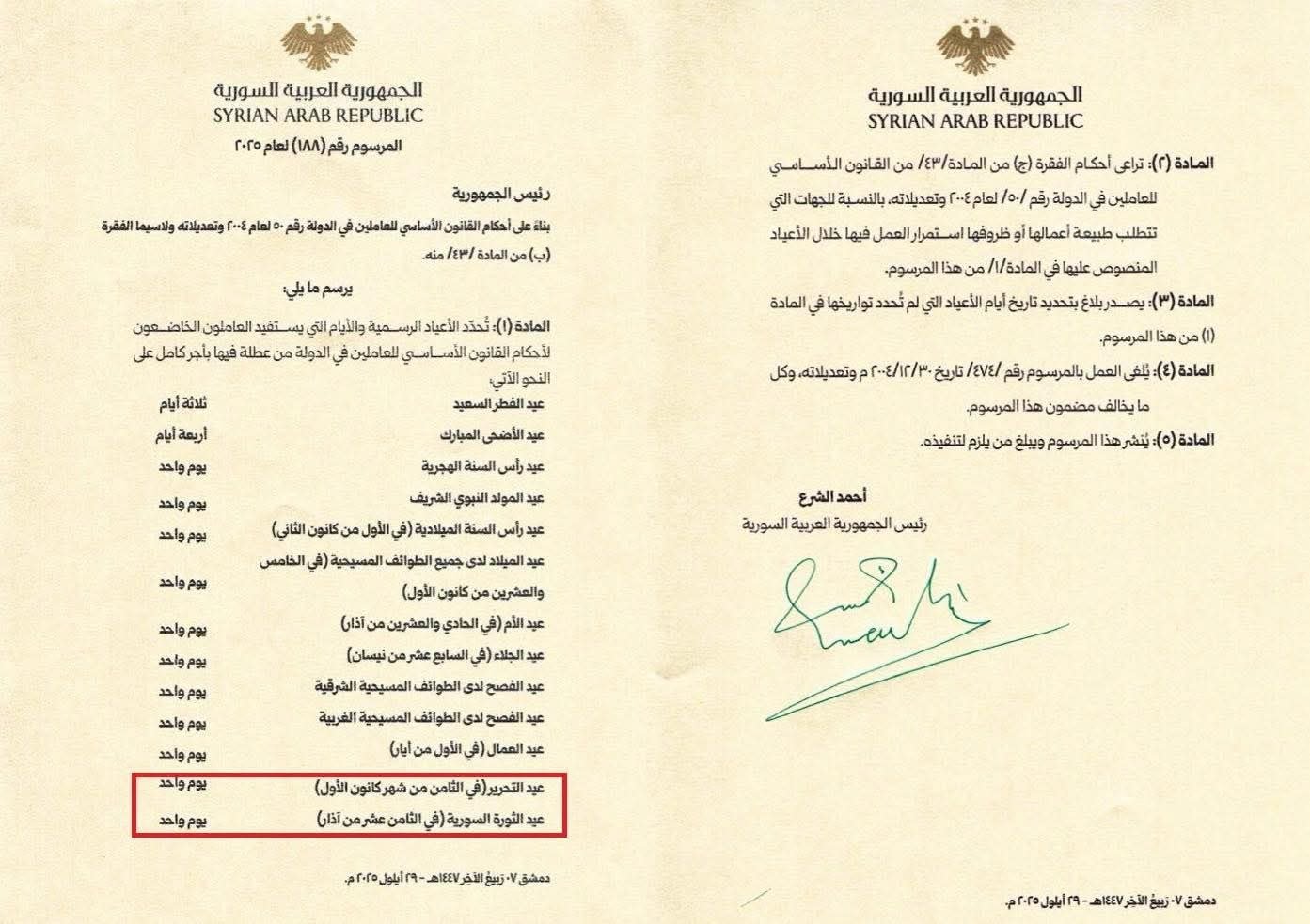 أصدر الرئيس أحمد الشرع المرسوم رقم (188) لعام 2025 القاضي بتحديد الأعياد الرسمية والأيام التي يستفيد خلالها العاملون الخاضعون لأحكام القانون الأساسي للعاملين في الدولة من عطلة بأجر كامل.