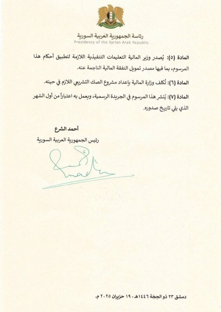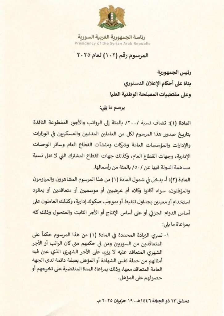 أصدر الرئيس السوري أحمد الشرع اليوم مرسومين تشريعيين حملا الرقمين 102 و103، تضمنا زيادات مالية كبيرة تطال شريحة واسعة من العاملين والمتقاعدين في البلاد، في خطوة تهدف إلى تحسين المستوى المعيشي في ظل الظروف الاقتصادية الراهنة.