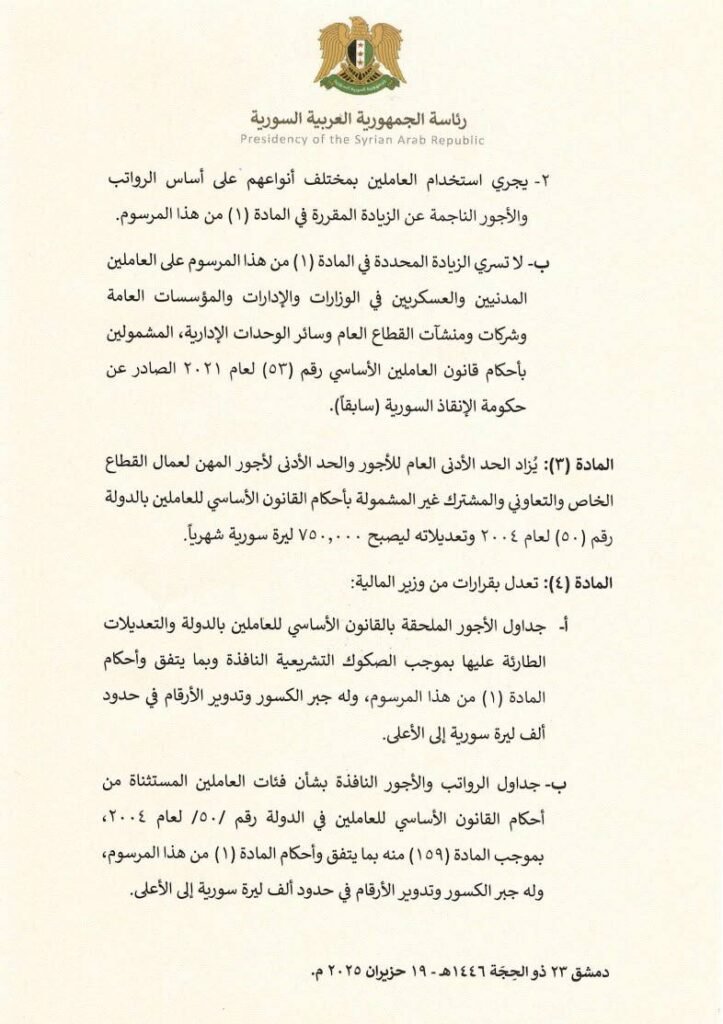 أصدر الرئيس السوري أحمد الشرع اليوم مرسومين تشريعيين حملا الرقمين 102 و103، تضمنا زيادات مالية كبيرة تطال شريحة واسعة من العاملين والمتقاعدين في البلاد، في خطوة تهدف إلى تحسين المستوى المعيشي في ظل الظروف الاقتصادية الراهنة.
