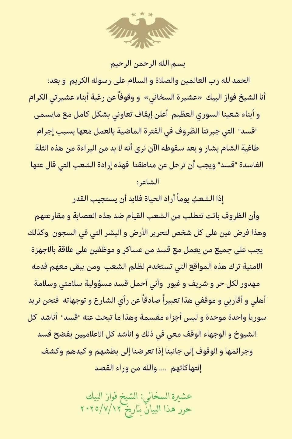 أعلن الشيخ فواز البيك، أحد وجهاء عشيرة السخاني، في بيان رسمي بتاريخ 12 يوليو 2025، “وقف أي تعاون مع قسد ورفض الصمت عن ممارساتها”، داعيًا إلى انسحابها الفوري من الرقة. وجاء في البيان أن الظروف باتت تتطلب من الشعب القيام ضد هذه “العصابة” ومقارعتهم، وأن هذا “فرض عين على كل شخص لتحرير الأرض والبشر التي في السجون”. كما ناشد الشيخ فواز البيك جميع من يعمل مع “قسد” من عساكر وموظفين بترك هذه المواقع، وحمل “قسد” مسؤولية سلامته وسلامة أهله وأقاربه، مؤكداً أن موقفه هذا تعبير صادق عن رأي الشارع وتوجهاته، وأنهم يريدون سوريا واحدة موحدة وليست أجزاء مقسمة.