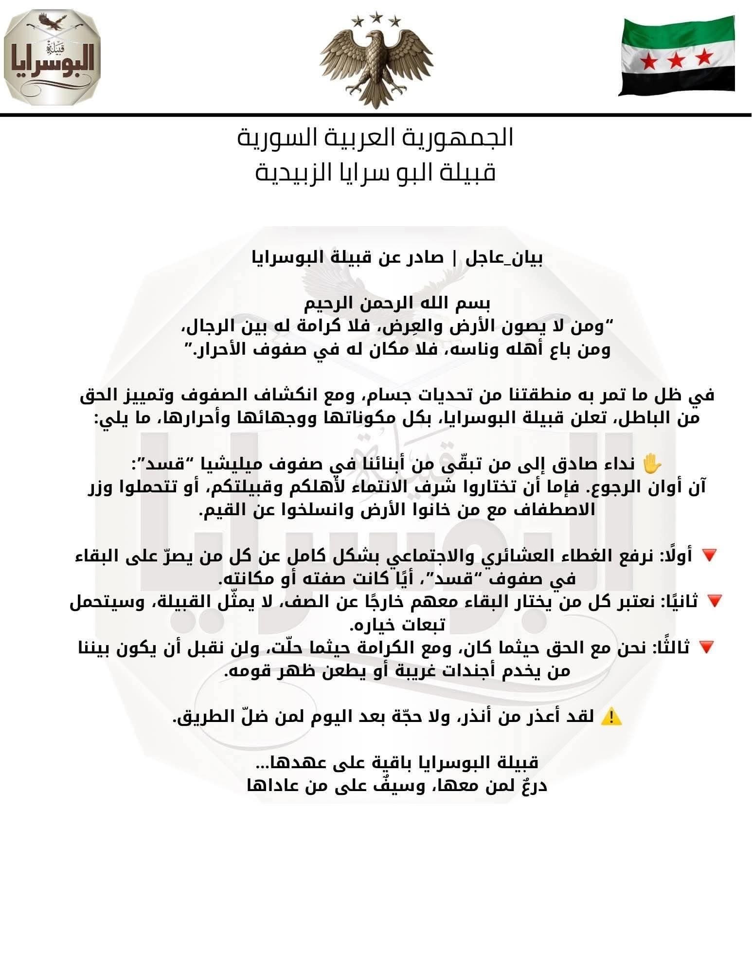كما أصدرت قبيلة البوسرايا الزبيدية بيانًا مماثلًا طالبت فيه أبنائها بقطع العلاقة مع “قسد”، والانسحاب من مشروع “لا يمثل العشائر ولا يخدم أهل المنطقة”. وجاء في بيان القبيلة: “نداء صادق إلى من تبقى من أبنائنا في صفوف ميليشيا قسد: آن أوان الرجوع. فإما أن تختاروا شرف الانتماء لأهلكم وقبيلتكم، أو تتحملوا وزر الاصطفاف مع من خانوا الأرض وانسلخوا عن القيم.” وأكدت القبيلة رفع الغطاء العشائري والاجتماعي بشكل كامل عن كل من يصر على البقاء في صفوف “قسد”، وأن كل من يختار البقاء معهم خارجًا عن الصف لا يمثل القبيلة وسيتحمل تبعات خياره، مؤكدة أنها مع الحق والكرامة ولن تقبل من يخدم أجندات غريبة أو يطعن ظهر قومه.