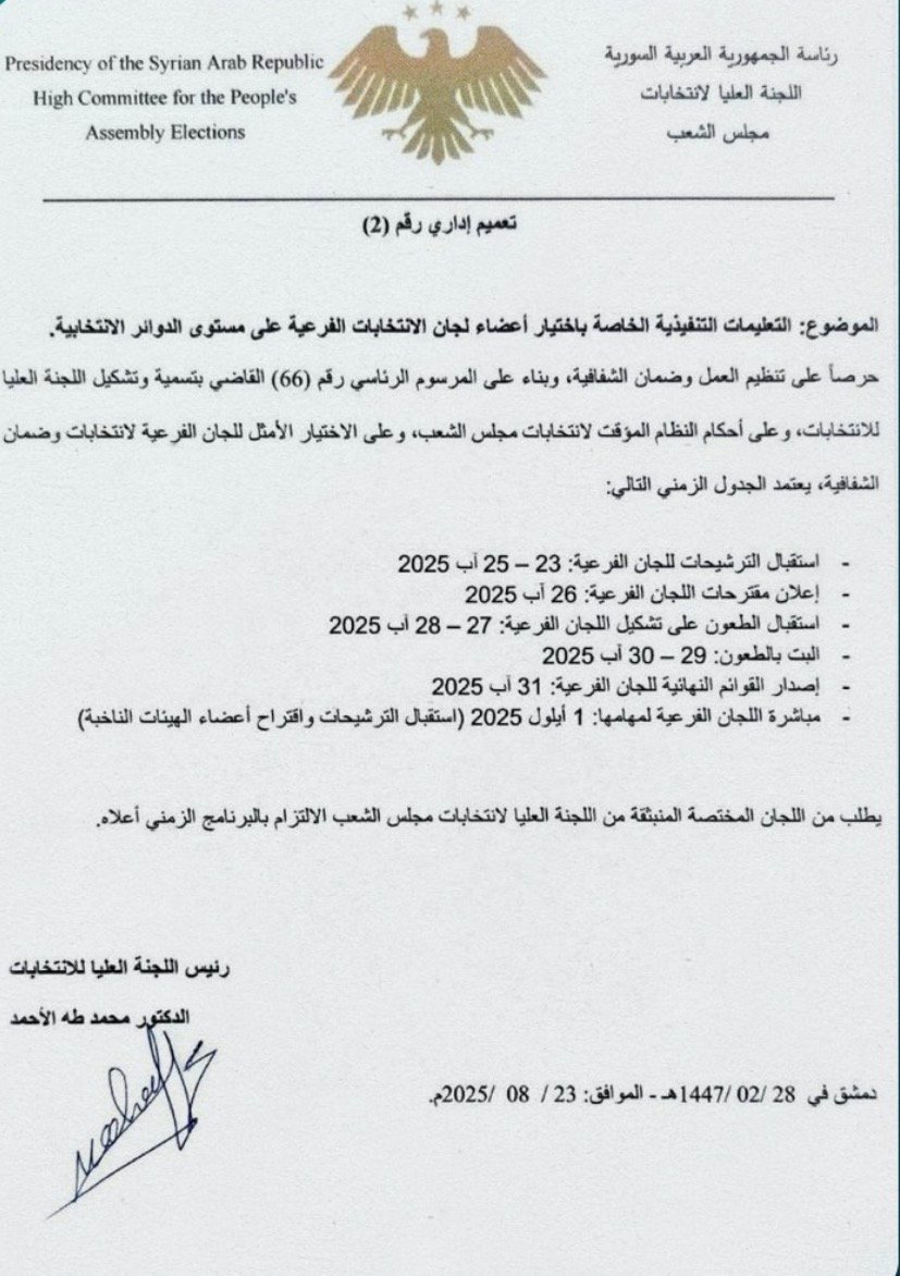 ويأتي ذلك بعد أيام من إصدار الرئيس أحمد الشرع المرسوم رقم (143) لعام 2025 المتعلق بالمصادقة على النظام الانتخابي المؤقت لمجلس الشعب