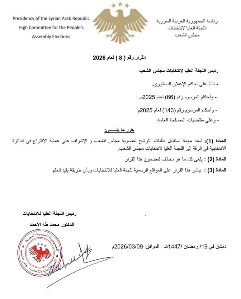 وبالتزامن مع ذلك، أعلنت اللجنة الفرعية لانتخابات مجلس الشعب في محافظة الرقة انسحابها من متابعة مهامها المتعلقة بالإجراءات والعمليات الانتخابية، في خطوة تعكس تصاعد الخلافات داخل العملية الانتخابية في المحافظة.