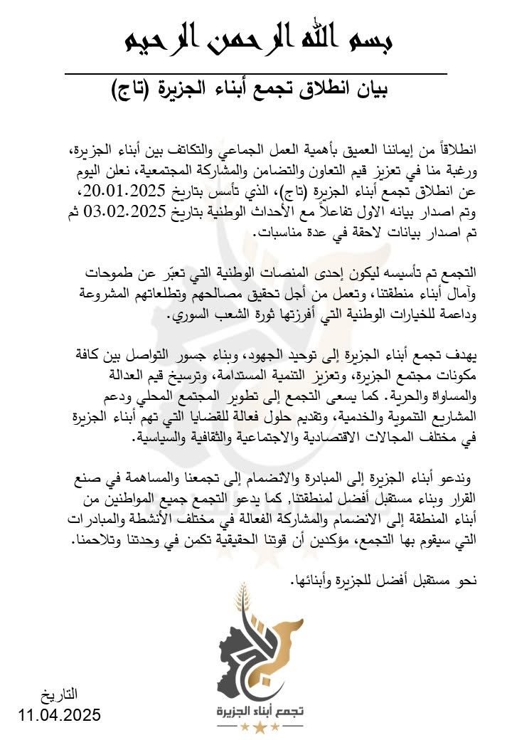 أعلن مجموعة من أبناء منطقة الجزيرة السورية عن انطلاق تجمع أبناء الجزيرة (تاج)، كمبادرة وطنية تهدف إلى توحيد الجهود المجتمعية وتعزيز قيم التعاون والتنمية المستدامة، استجابة للتحديات الراهنة والتطلعات المستقبلية لأبناء المنطقة.