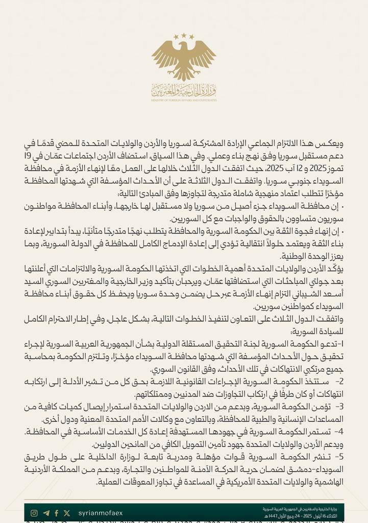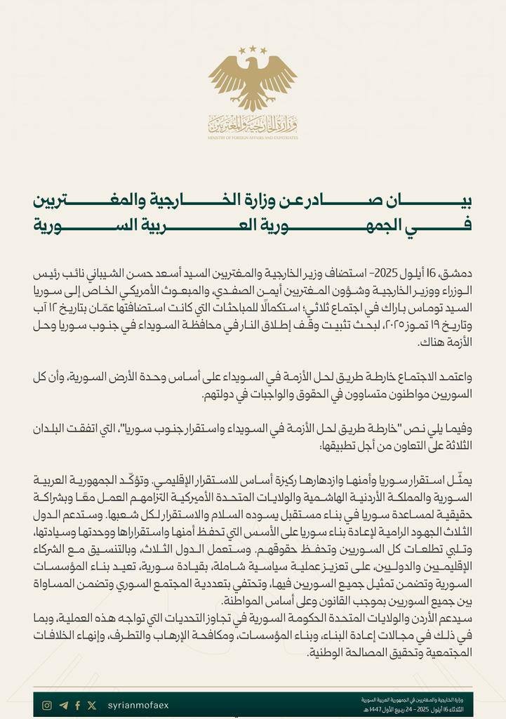بيان سوري–أميركي–أردني مشترك: خريطة طريق لحل أزمة السويداء تشمل مجلس محلي جامع، قوة شرطة موحدة، وسحب المقاتلين المدنيين من الحدود