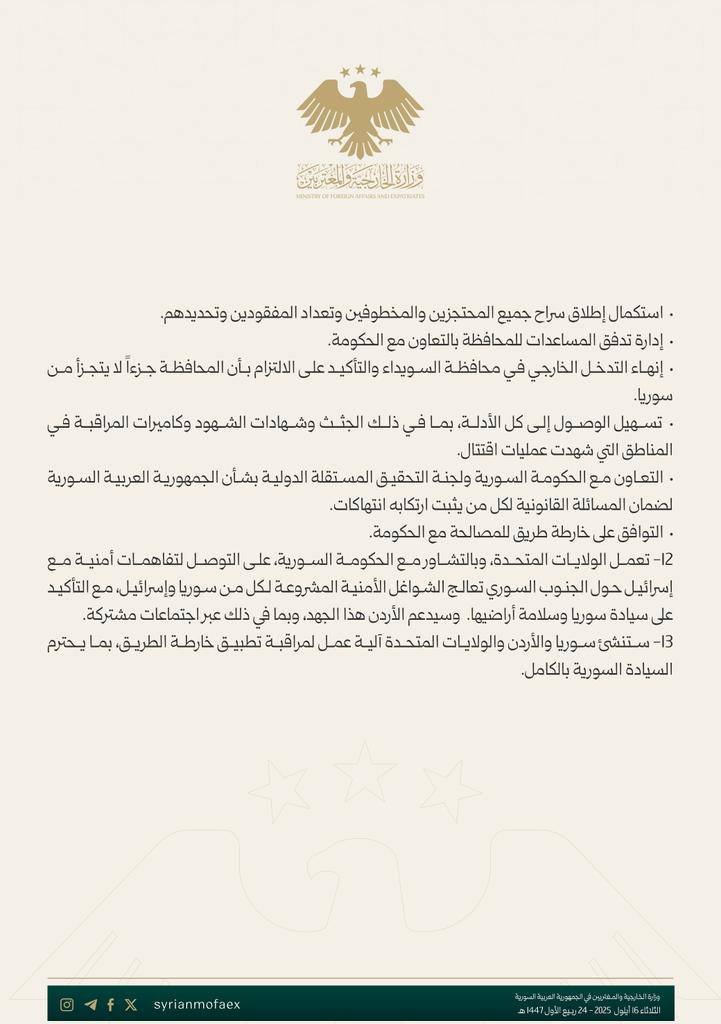 • التعاون الثلاثي السوري–الأميركي–الأردني لمتابعة تنفيذ الخطة بشكل عاجل عبر آلية مراقبة مشتركة تحترم السيادة السورية.