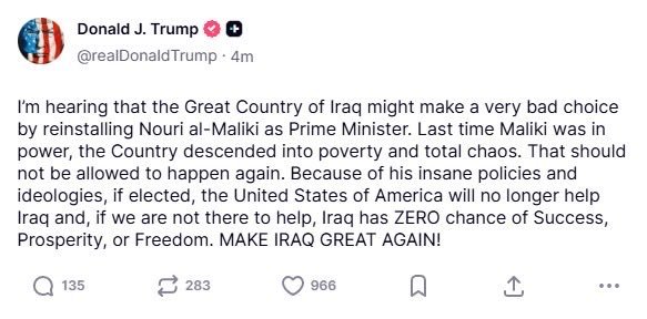 وقال ترامب، في تصريح لافت، إنه «يسمع أن الدولة العظيمة العراق قد تتخذ خيارًا سيئًا جدًا بإعادة تنصيب نوري المالكي»، مضيفًا أن «العراق انحدر إلى الفقر والفوضى الشاملة في المرة الأخيرة التي كان فيها المالكي في السلطة»، ومؤكدًا أنه «لا ينبغي السماح بحدوث ذلك مرة أخرى».