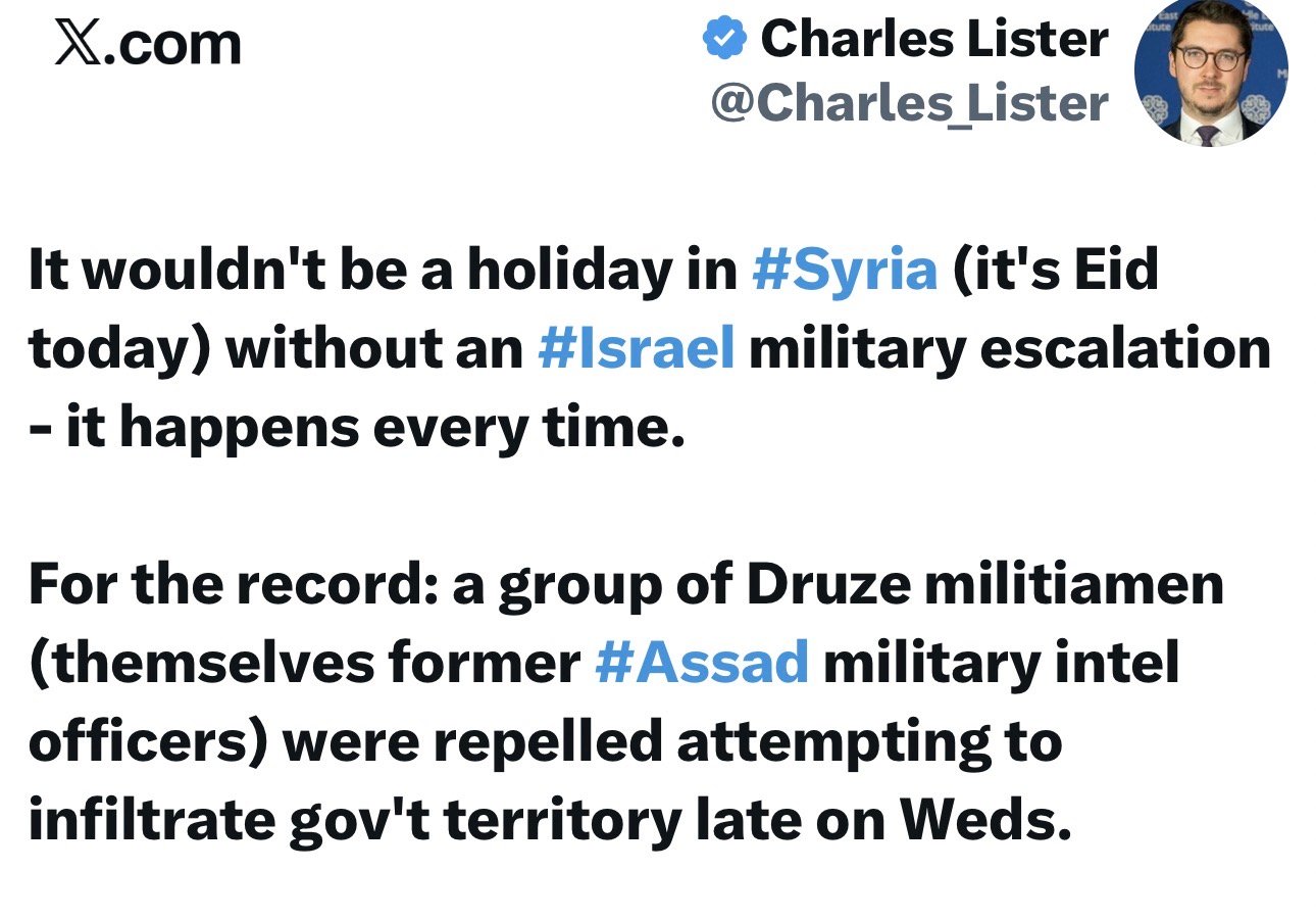 في قراءة متقاطعة، اعتبر الباحث والمحلل السياسي تشارلز ليستر أن التصعيد الإسرائيلي في سوريا يتكرر بشكل لافت خلال المناسبات، مشيرًا إلى أن “العطل في سوريا، ومنها عيد الفطر، غالبًا ما تتزامن مع عمليات عسكرية إسرائيلية”.