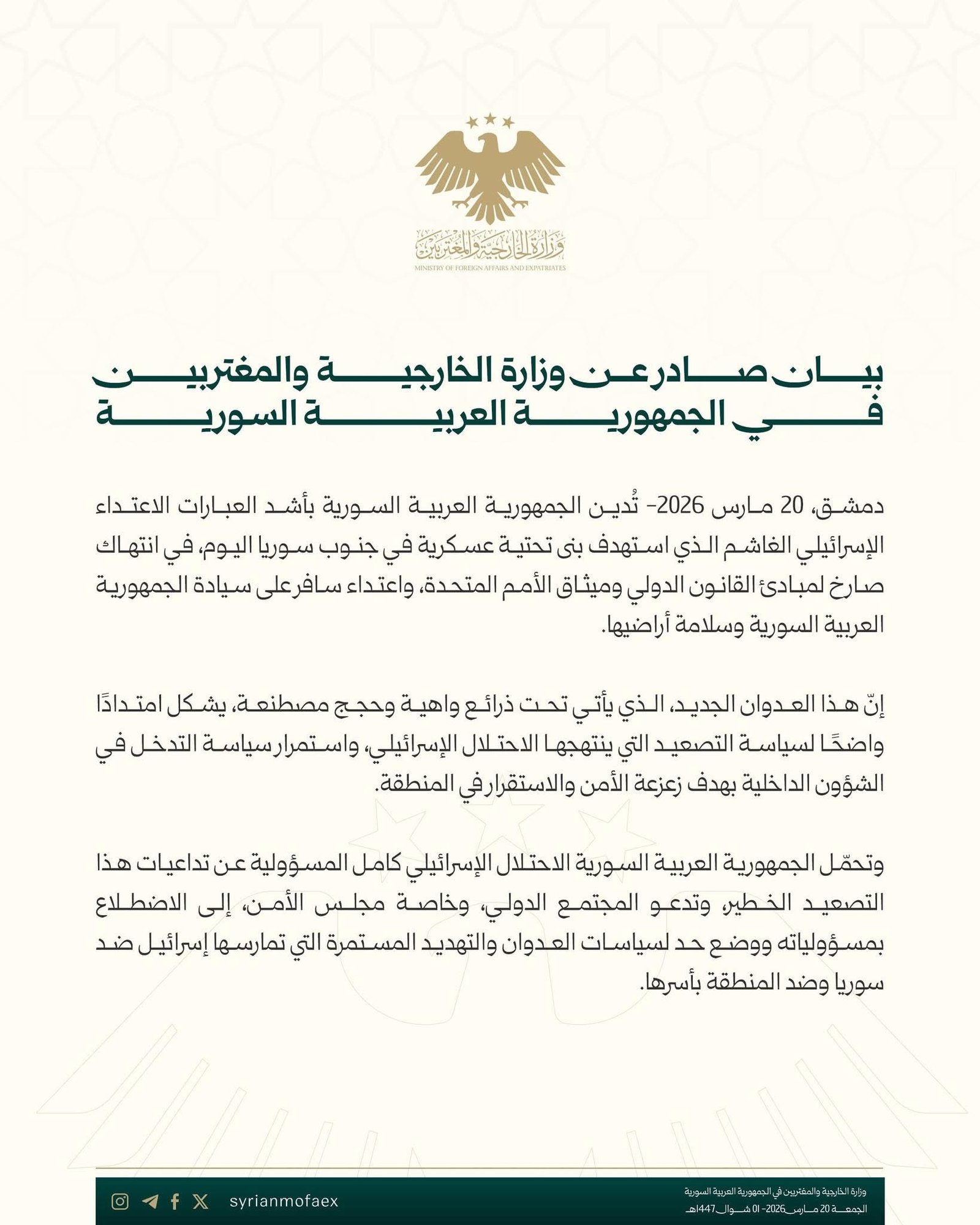 بالتوازي، أدانت وزارة الخارجية السورية في بيان رسمي الضربات الإسرائيلية الأخيرة التي استهدفت بنى تحتية في جنوب البلاد، معتبرة أنها تمثل انتهاكًا صارخًا للقانون الدولي واعتداءً على السيادة الوطنية.