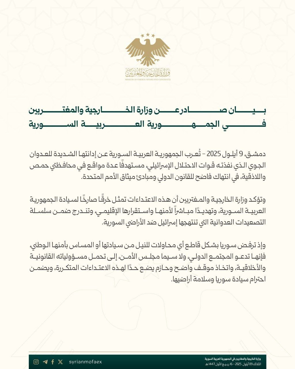 في المقابل، أدانت وزارة الخارجية السورية القصف الإسرائيلي الأخير الذي استهدف مواقع في محافظتي حمص واللاذقية، واعتبرته “انتهاكاً صارخاً للقانون الدولي وميثاق الأمم المتحدة”، مؤكدة أن هذه الاعتداءات تشكل “خرقاً خطيراً لسيادة سوريا واستقرارها”.