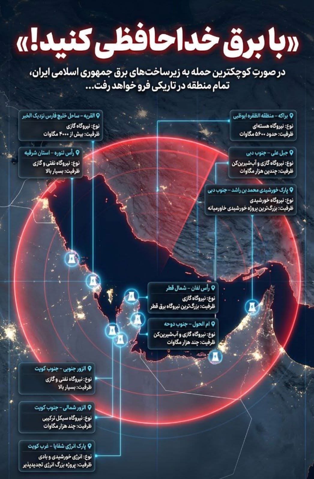 وبحسب ما ورد في تقرير “مهر”، فإن الرد الإيراني المحتمل قد يشمل استهداف نحو 10 منشآت طاقة كبرى موزعة في كل من السعودية وقطر والكويت والإمارات. وجاء في نص التهديد عبارة لافتة: “ودّع الكهرباء!”، في إشارة إلى تداعيات أي تصعيد عسكري على إمدادات الطاقة في المنطقة.