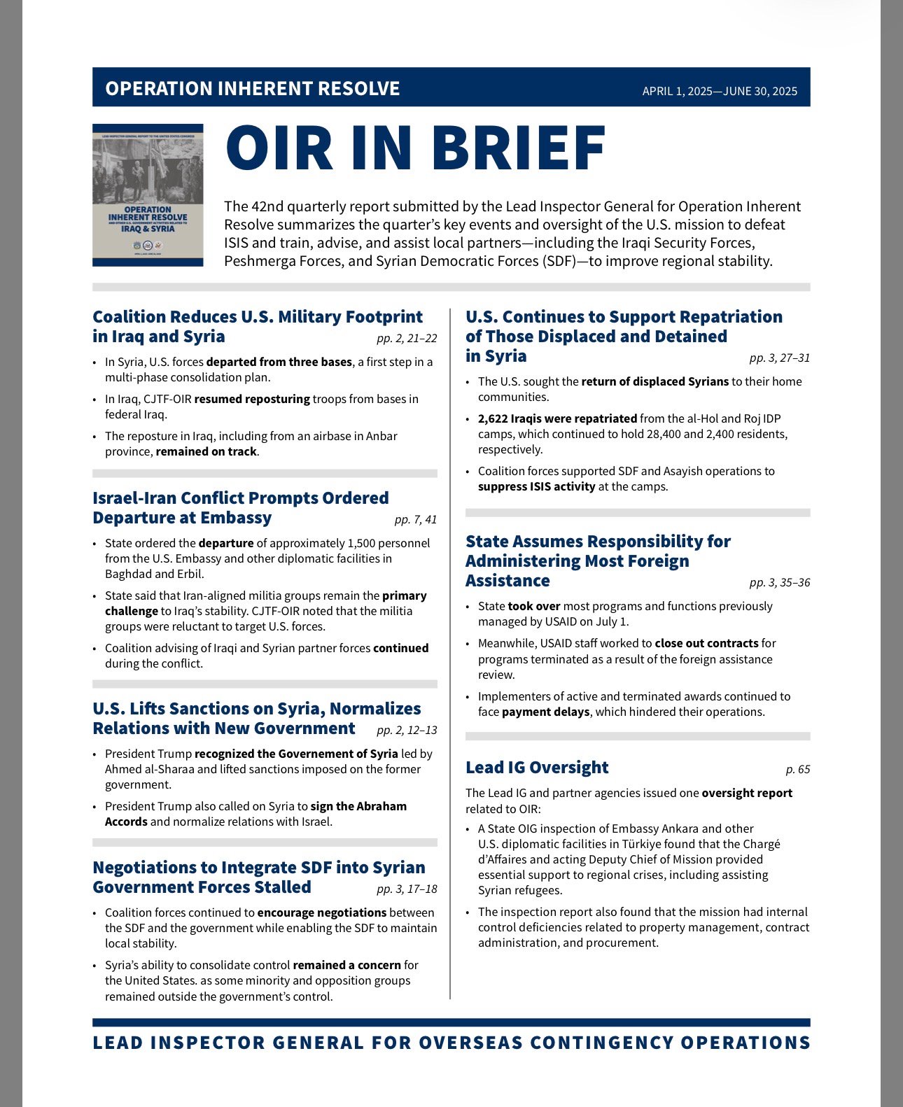 تقرير المفتش العام الأميركي:التحالف الدولي في مفترق طرق: واشنطن تقلّص وجودها في سوريا والعراق ومفاوضات قسد مع الحكومة السورية تتعثر