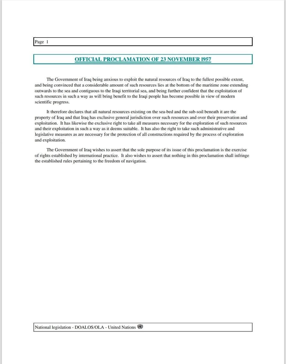 ويستند العراق في موقفه إلى سوابق قانونية وتاريخية، من بينها إعلان رسمي بعث به إلى الأمم المتحدة بتاريخ 23 نوفمبر 1957، أكد فيه أن جميع الموارد الطبيعية الموجودة في قاع البحر وباطنه ضمن مناطقه البحرية هي ملك للدولة العراقية، وأن لبغداد الولاية القضائية الحصرية على تلك الموارد واستكشافها واستغلالها، مع التأكيد على عدم تعارض ذلك مع قواعد حرية الملاحة الدولية.