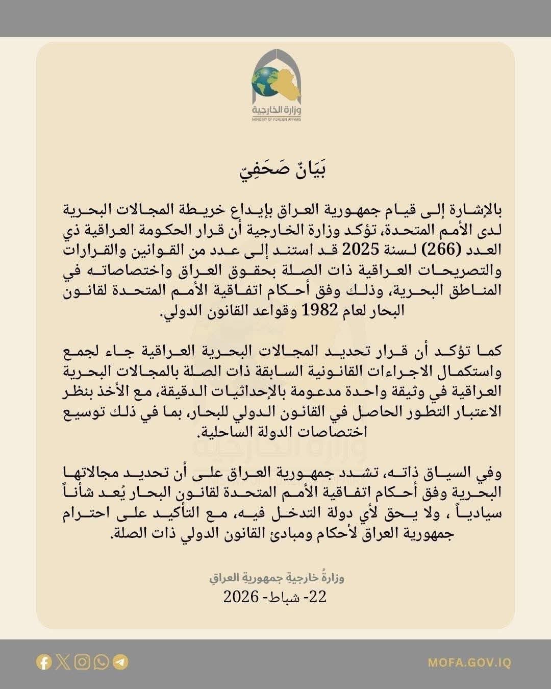 في المقابل، ردت وزارة الخارجية العراقية ببيان أكدت فيه أن تحديد المجالات البحرية للعراق يُعد شأناً سيادياً لا يحق لأي دولة التدخل فيه، موضحة أن قرار الحكومة رقم (266) لسنة 2025 استند إلى مجموعة من القوانين والقرارات والتصريحات العراقية المتعلقة بحقوق العراق واختصاصاته في المناطق البحرية.