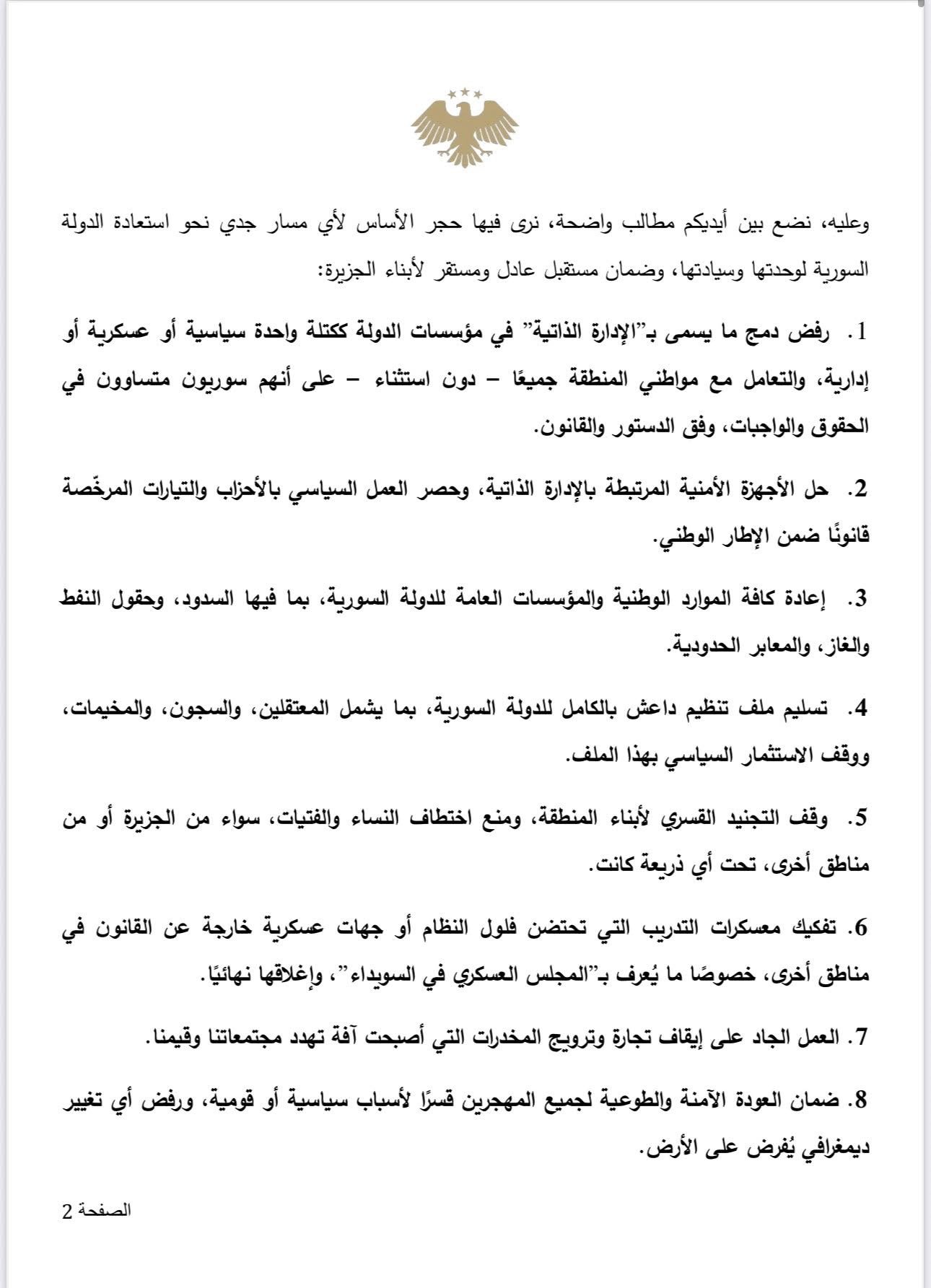 وأكدت الوثيقة أن هذه المطالب تعبّر عن موقف موحّد لأبناء الجزيرة السورية، تم توقيعه من مئات الشخصيات والهيئات السياسية والاجتماعية والعشائرية، إلى جانب منظمات مجتمع مدني محلية وناشطين سوريين في أوروبا والخليج وأميركا، معتبرة أنها “تمثّل صوت أبناء المنطقة وتطلعاتهم نحو حل سياسي شامل يعيد السيادة للدولة السورية”.