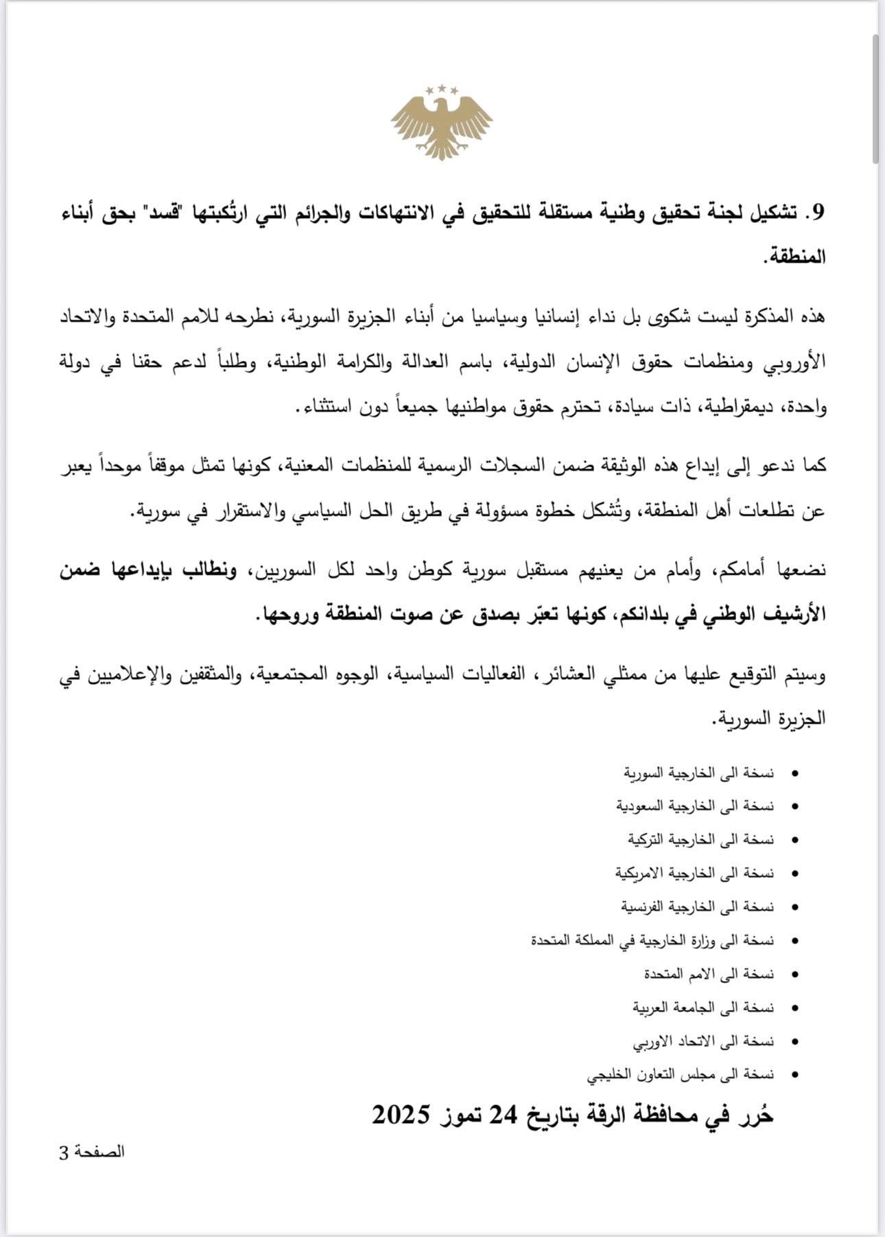 كما شدد الموقعون على ضرورة إيداع هذه المذكرة في الأرشيف الوطني لدى سوريا، والولايات المتحدة، وفرنسا، والمنظمات الحقوقية المعنية، لتكون “وثيقة مرجعية تعبّر عن معاناة السكان ورفضهم لسلطة الأمر الواقع، ولكل مشاريع التقسيم والانفصال”، على حد تعبيرهم.