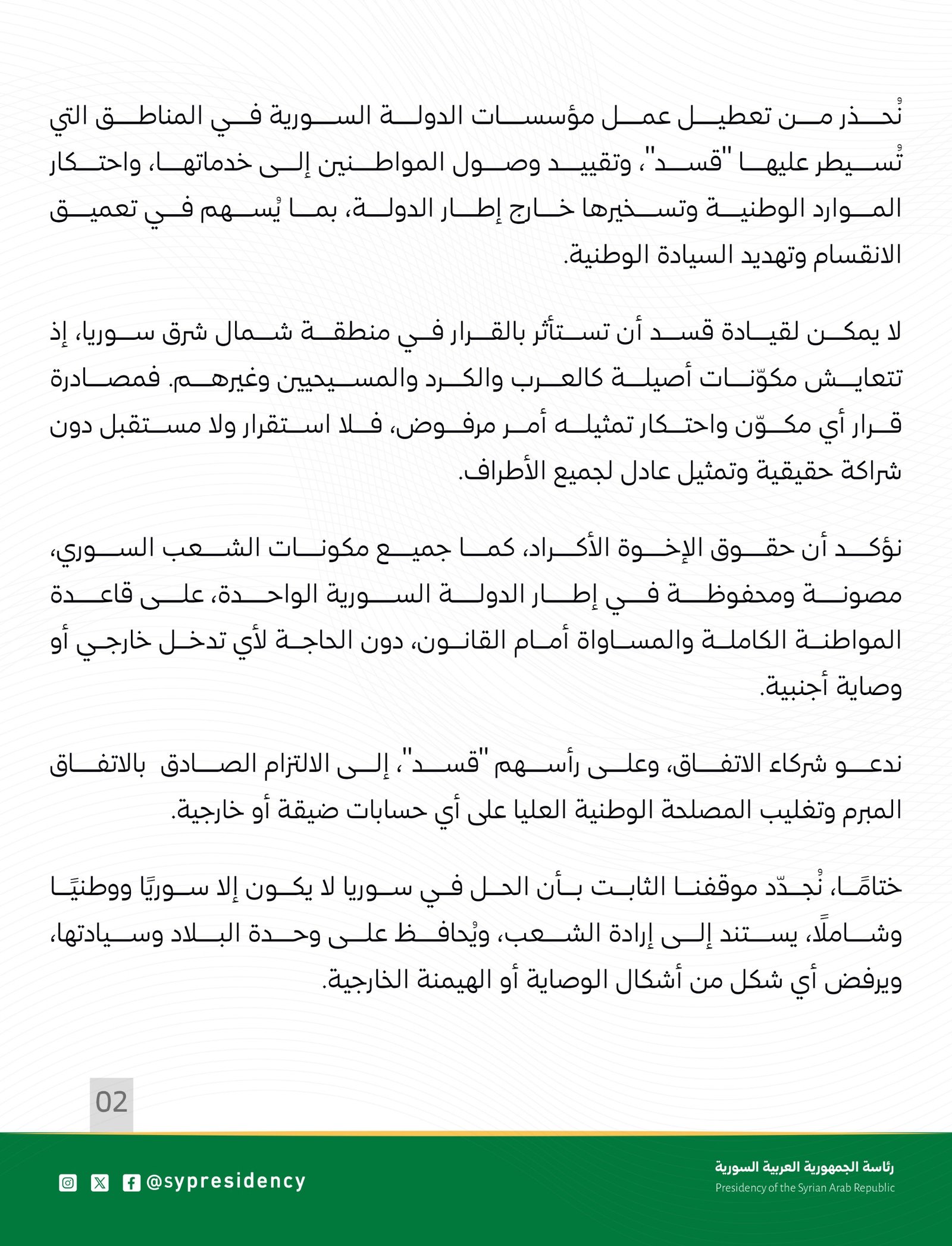 ودعت رئاسة الجمهورية شركاء الاتفاق، وفي مقدمتهم “قسد”، إلى الالتزام الصادق بالاتفاق الموقع، وتغليب المصلحة الوطنية العليا على أي حسابات ضيقة أو أجندات خارجية.