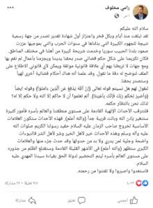 وأعرب مخلوف عن اعتقاده بأن الأشهر القليلة القادمة ستشهد اقتلاع “الظلم من جذوره على مستوى العالم بأسره، ليتم التحضير لدولة الحق بقيادة سيدنا المهدي عليه السلام”، داعياً إلى ترقب “الأحداث الإلهية القادمة على مستوى منطقتنا والعالم بأسره فأمور كثيرة ستتغير بإذن الله وباتت قريبة جداً”، وفق تعبيره.
