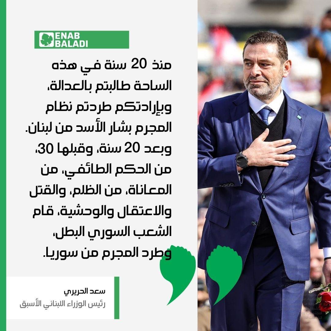 واستهل الحريري كلمته بالإشارة إلى محطة مفصلية في تاريخ لبنان، قائلًا: “منذ 20 سنة في هذه الساحة طالبتمبالعدالة، وبإرادتكم طردتم نظام المجرم بشار الأسد من لبنان. وبعد 20 سنة، وقبلها 30 من الحكم الطائفيوالمعاناة، قام الشعب السوري البطل وطرد المجرم من سوريا”.