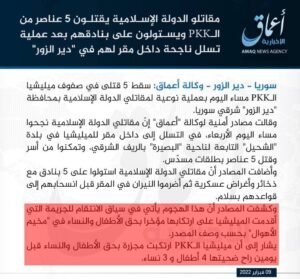 أصدر تنظيم الدولة “د.ا.عش”، اليوم، بيان عير معرفاته تبنى فيه فيه الهجوم على نقطة عسكرية تابعة لقوات سوريا الديمقراطية بمدينة الشحيل في ريف ديرالزور الشرقي بعد التسلل إلى إحدى النقاط والاستيلاء على الأسلحة.