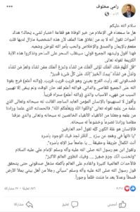 وأكد مخلوف أن “الفرج قريب”، وأضاف: “أعلم لقد حان الوقت ولم يبق إلا تهييئ السبب من مُهيّء الأسباب والذي سنراه قريباً”.