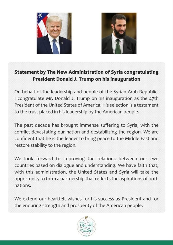 واختتم الشرع بيانه بتوجيه تمنياته القلبية بالنجاح للرئيس ترامب في قيادته، وللشعب الأمريكي بالقوة والازدهار الدائم.