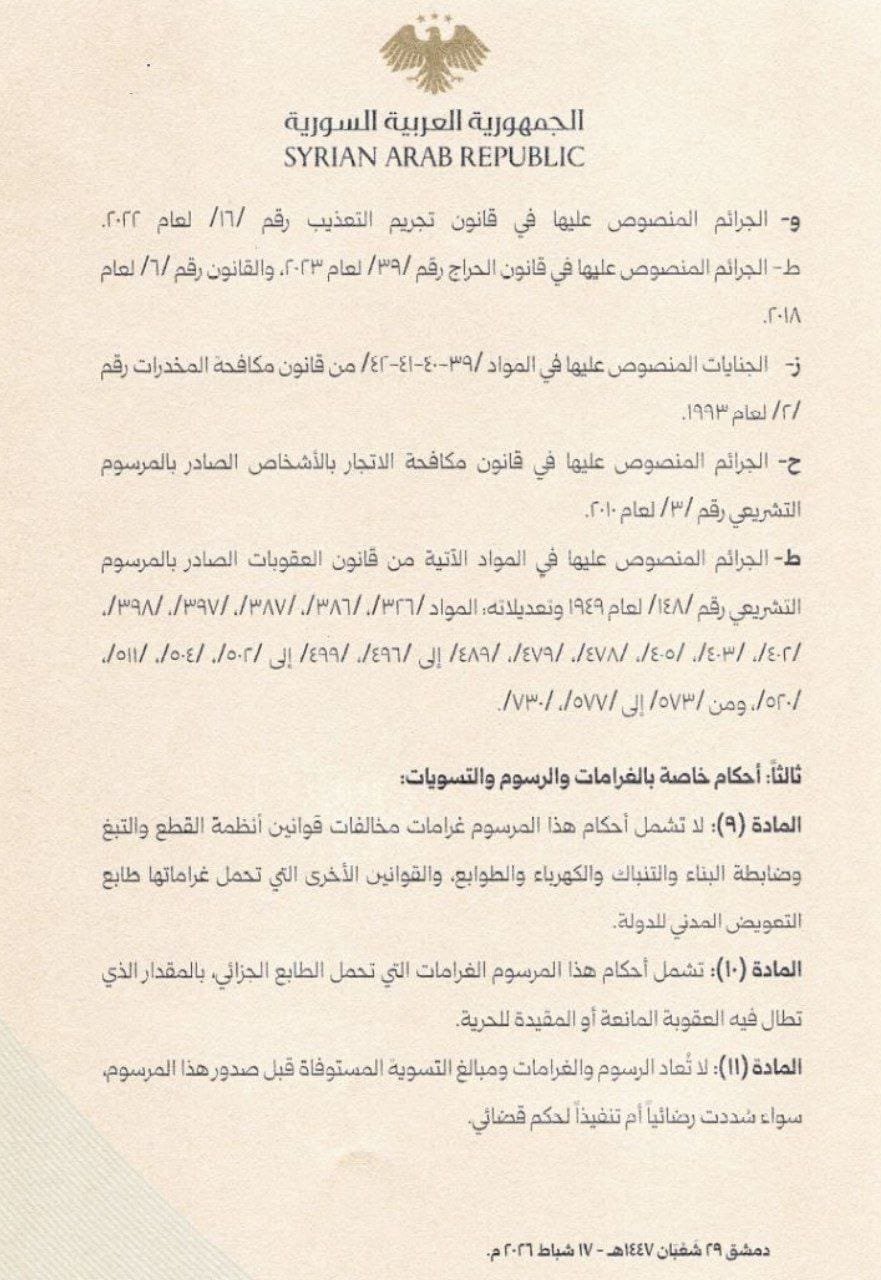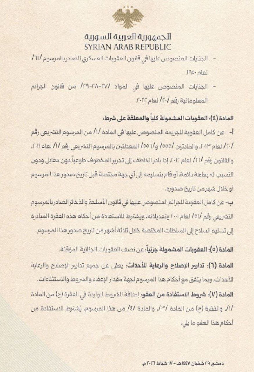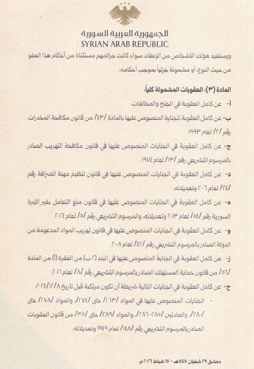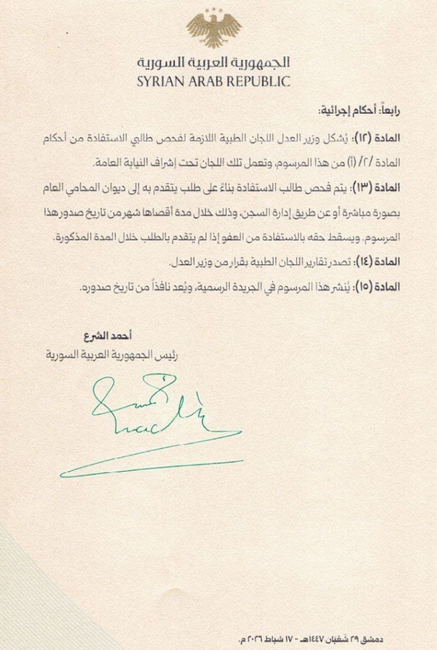 مرسوم رئاسي بالعفو العام في سوريا يشمل الجرائم المرتكبة قبل 17 شباط 2026 مع استثناءات محددة