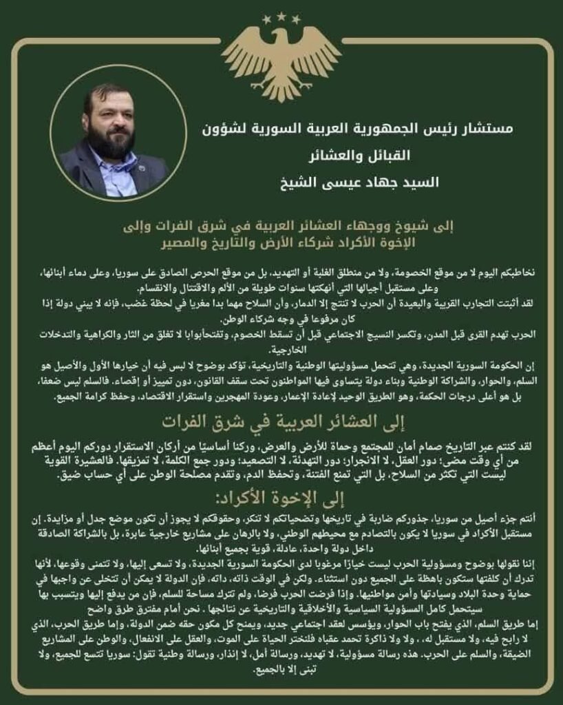 أصدر مستشار رئيس الجمهورية العربية السورية لشؤون القبائل والعشائر، السيد جهاد عيسى الشيخ، بيانًا موجّهًا إلى شيوخ ووجهاء العشائر العربية في منطقة شرق الفرات، وإلى الإخوة الأكراد، شدّد فيه على عمق الروابط التاريخية ووحدة المصير التي تجمع أبناء المنطقة، مؤكدًا أن العرب والأكراد شركاء في الأرض والتاريخ والمصير المشترك.