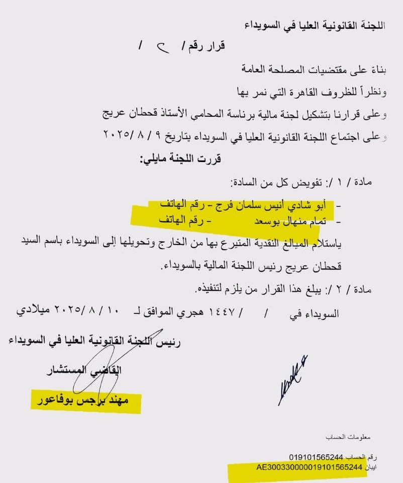 كما أظهرت الوثيقة تفويض كل من “أبو شادي أنيس سلمان فرح” و”تمام منهل بوسعد” باستلام الأموال وتحويلها، ما يثير تساؤلات ومخاوف حول مسار هذه الأموال وآلية إنفاقها، في ظل غياب أي رقابة رسمية أو شفافية مالية.