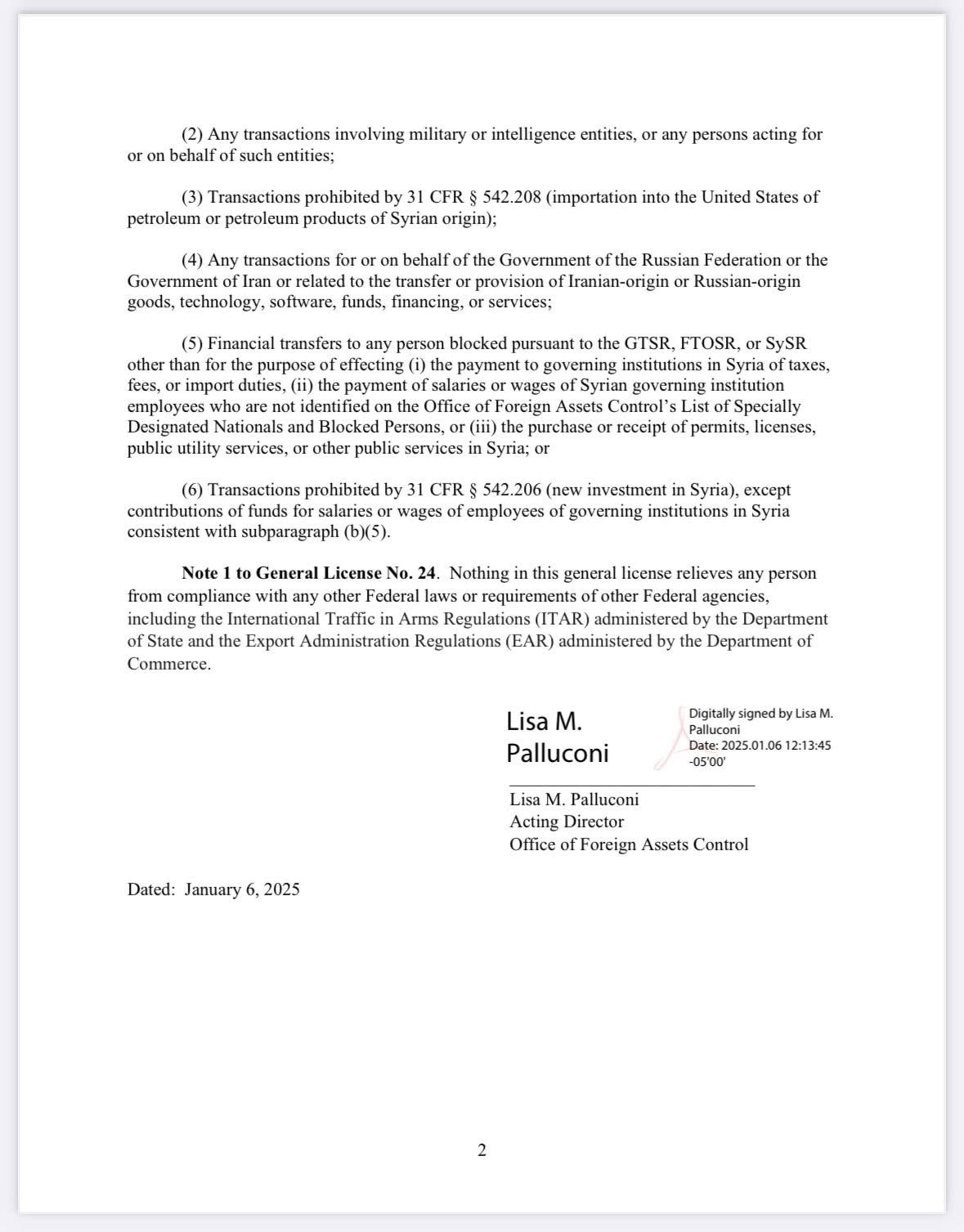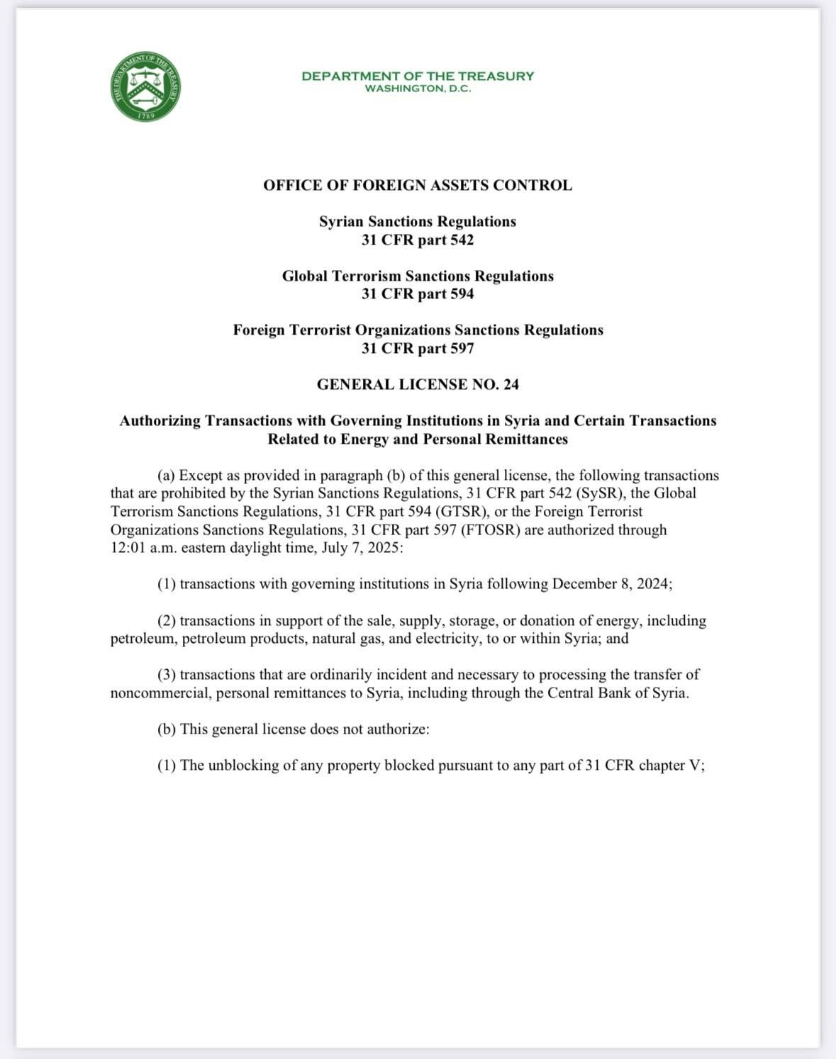 أعلنت وزارة الخزانة الأمريكية، ممثلة بمكتب مراقبة الأصول الأجنبية (OFAC)، اليوم عن إصدار الرخصة العامة رقم 24 التي تسمح بتنفيذ عدد من المعاملات مع المؤسسات الحكومية السورية حتى 7 يوليو 2025. تشمل الرخصة المعاملات مع المؤسسات الحكومية السورية بعد 8 ديسمبر 2024، فضلاً عن دعم صفقات تتعلق ببيع وتوريد وتخزين وتبرعات الطاقة بما في ذلك النفط والغاز الطبيعي والكهرباء، سواء داخل سوريا أو إليها، وتحويل الحوالات الشخصية غير التجارية إلى سوريا عبر المصرف المركزي السوري.