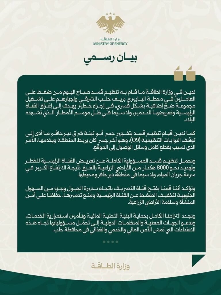 أصدرت وزارة الطاقة في الجمهورية العربية السورية بيانًا رسميًا أدانت فيه ما وصفته بالاعتداءات الخطيرة التي نفّذها تنظيم «قسد» بحق منشآت مائية حيوية في ريف حلب الشرقي، محذّرة من تداعياتها المباشرة على الأمن المائي والزراعي والخدمي في المنطقة.