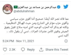 وفي تغريده قال الأمير عبدالرحمن: “صحيح أننا أقوى حزب سياسي وأقوى حزب مؤثر في الشارع ومن حيث الهياكل التنظيمية ولكنه لم يذكر أنه الحزب الوحيد الذي لديه سلاح ثقيل يفوق الجيش وقوى الأمن عشرات المرات.. نسي أن يقول ذلك.. أكيد نسي”.