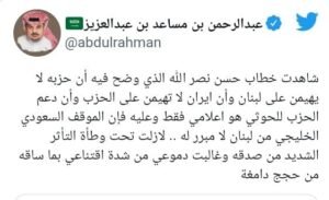 “لا زلت تحت وطأة التأثر الشديد من صدقه وغالبت دموعي من شدة اقتناعي بما ساقه من حجج دامغة..” هذا كان رد الأمير السعودي، عبدالرحمن بن مساعد، على خطاب الأمين العام لحزب الله اللبناني حسن نصرالله، مذكرا بخطاب أرشيفي له تناول فيه “مشروع الجمهورية الإسلامية التي يحكمها صاحب الزمان”.