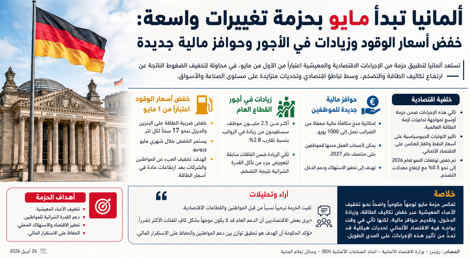 تستعد ألمانيا لتطبيق حزمة من الإجراءات الاقتصادية والمعيشية اعتباراً من الأول من مايو، في محاولة لتخفيف الضغوط الناتجة عن ارتفاع تكاليف الطاقة والتضخم، وسط تباطؤ اقتصادي وتحديات متزايدة على مستوى الصناعة والأسواق.