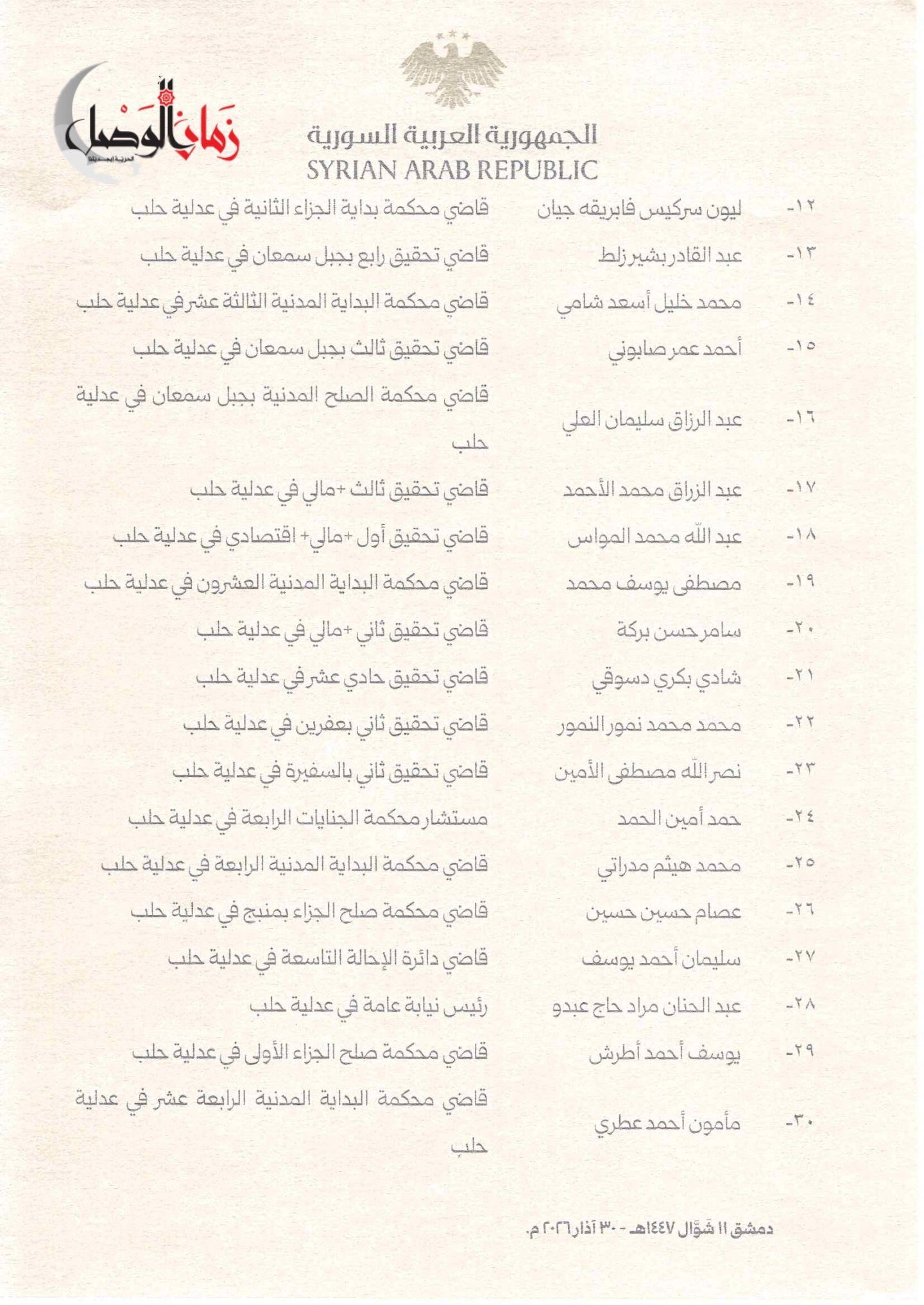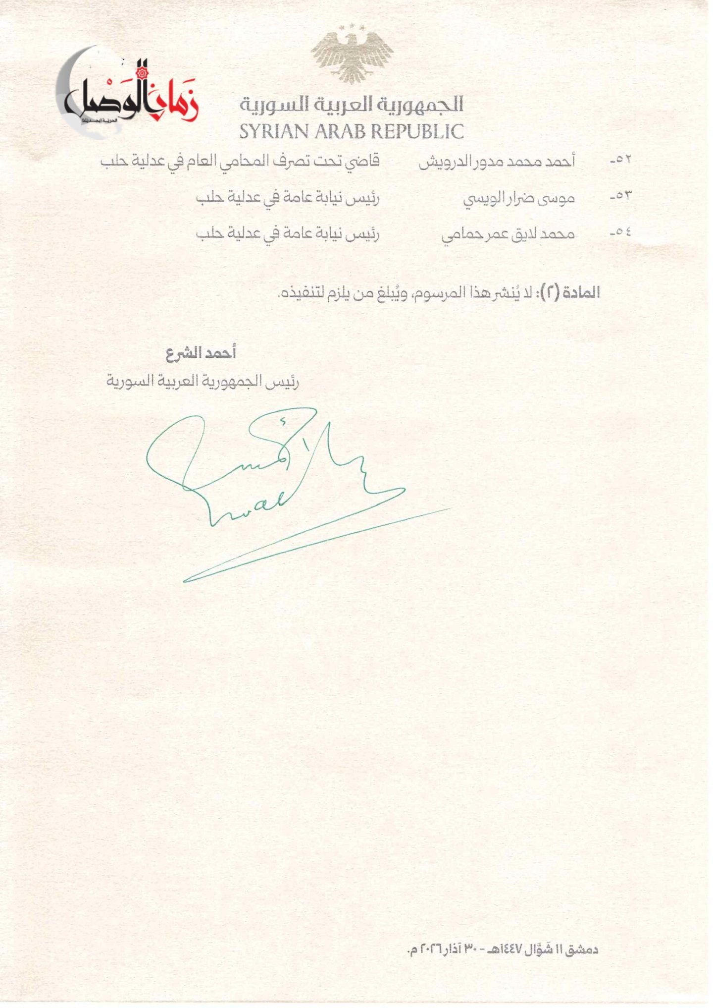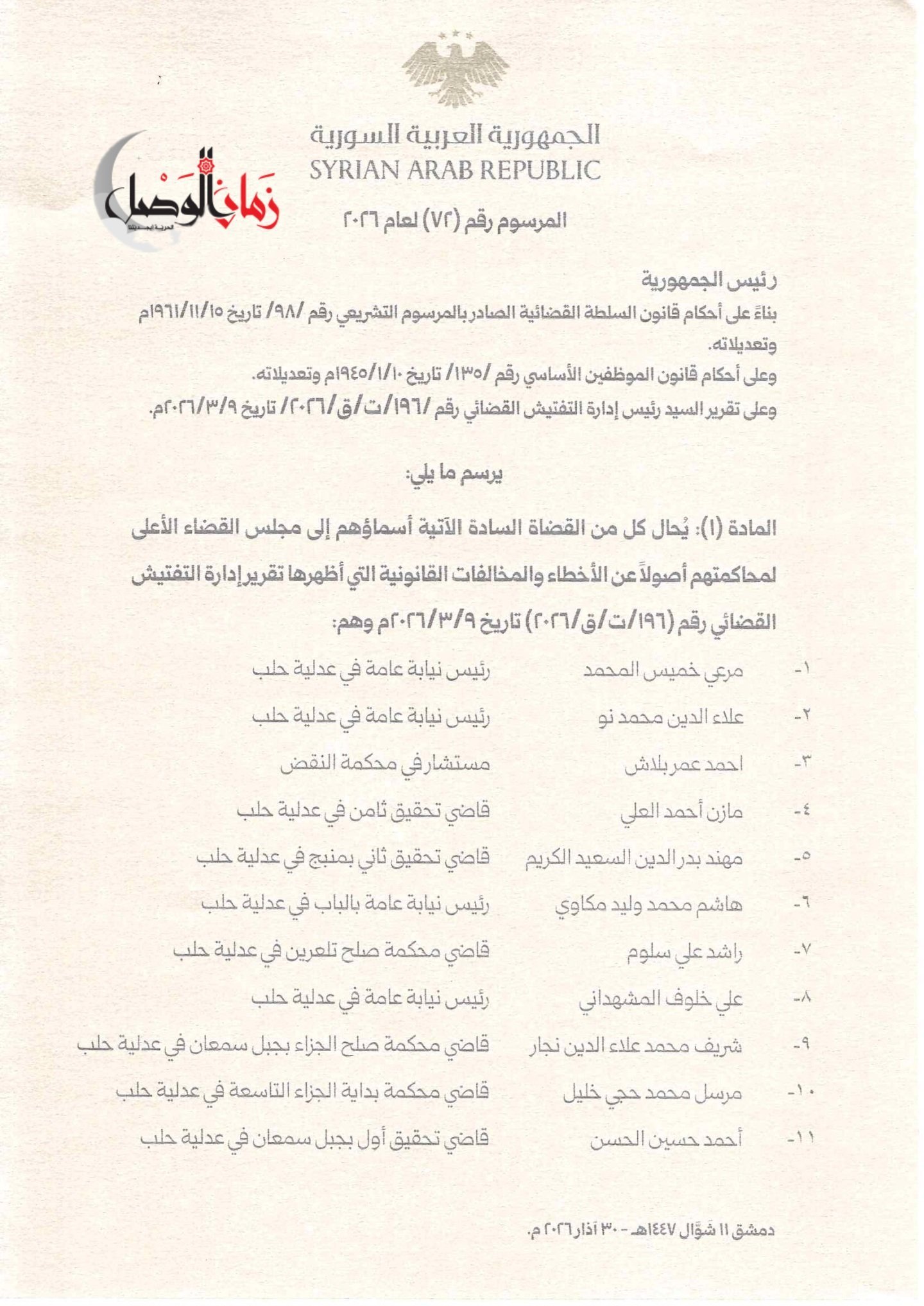 أصدر الرئيس السوري أحمد الشرع المرسوم رقم (72) لعام 2026، القاضي بإحالة 54 قاضياً من عدلية حلب إلى مجلس القضاء الأعلى، تمهيداً لمحاكمتهم على خلفية مخالفات وأخطاء قانونية موثقة في تقرير إدارة التفتيش القضائي رقم (196/ت/ق/2026).