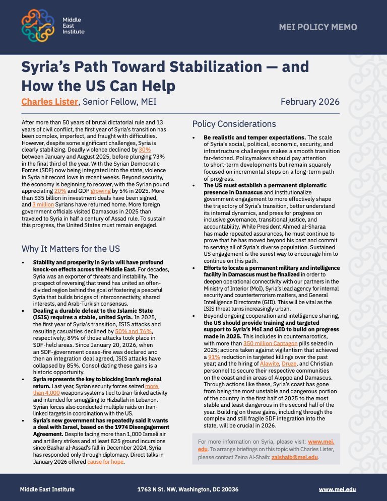 أصدر معهد الشرق الأوسط (MEI) مذكرة سياسات جديدة في فبراير 2026 تناولت تطورات المشهد السوري خلال العام الماضي، مؤكدة أن البلاد بدأت تدخل مرحلة أكثر استقرارًا بعد عقود من الحكم الاستبدادي وأكثر من 13 عامًا من الصراع، لكنها لا تزال تواجه تحديات عميقة على المستويات السياسية والاقتصادية والأمنية.